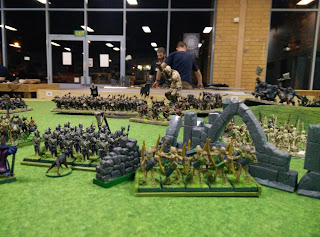 The rain intensified and the winds picked up, as visibility dropped and the noise made it all but impossible to pass orders. On the right flank, the Vampire Lord, his Zombie Werewolf retinue and Wight honour guard had crushed the Trolls and Orc Big Ax regiment, and were turning to the centre.