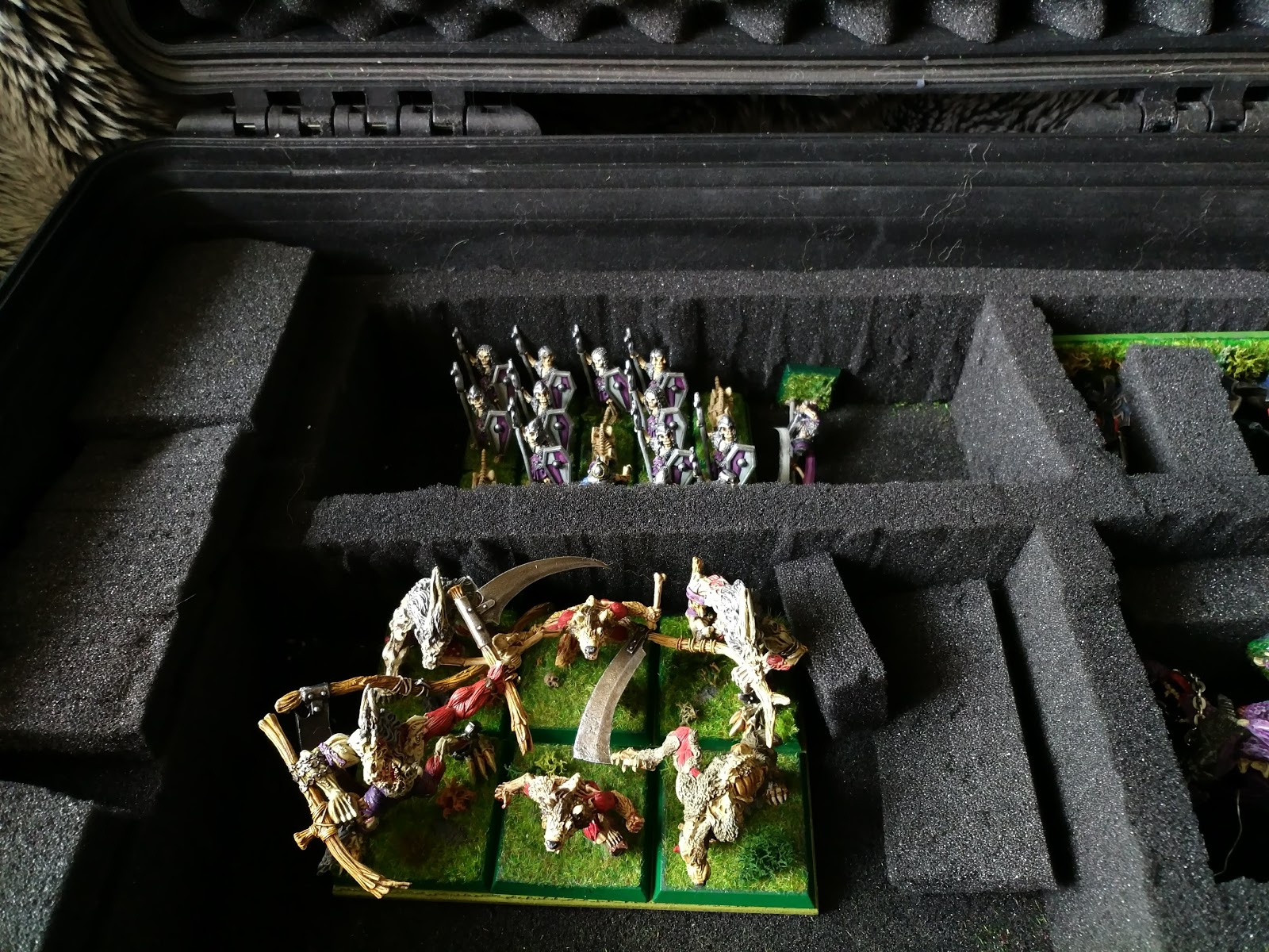 The second case I cut to two depths as described above. The top layer I can use for laying down a troop of cavalry (they can come off their unit base as they are magnetised), or just holding my spare unit bases (which are useful for trialling unit movement in-game without moving the actual units). The lower, deep layer is the one previously shown with the werewolves. The individual slots in the top layer were for the soul reaver infantry before I multibased them.